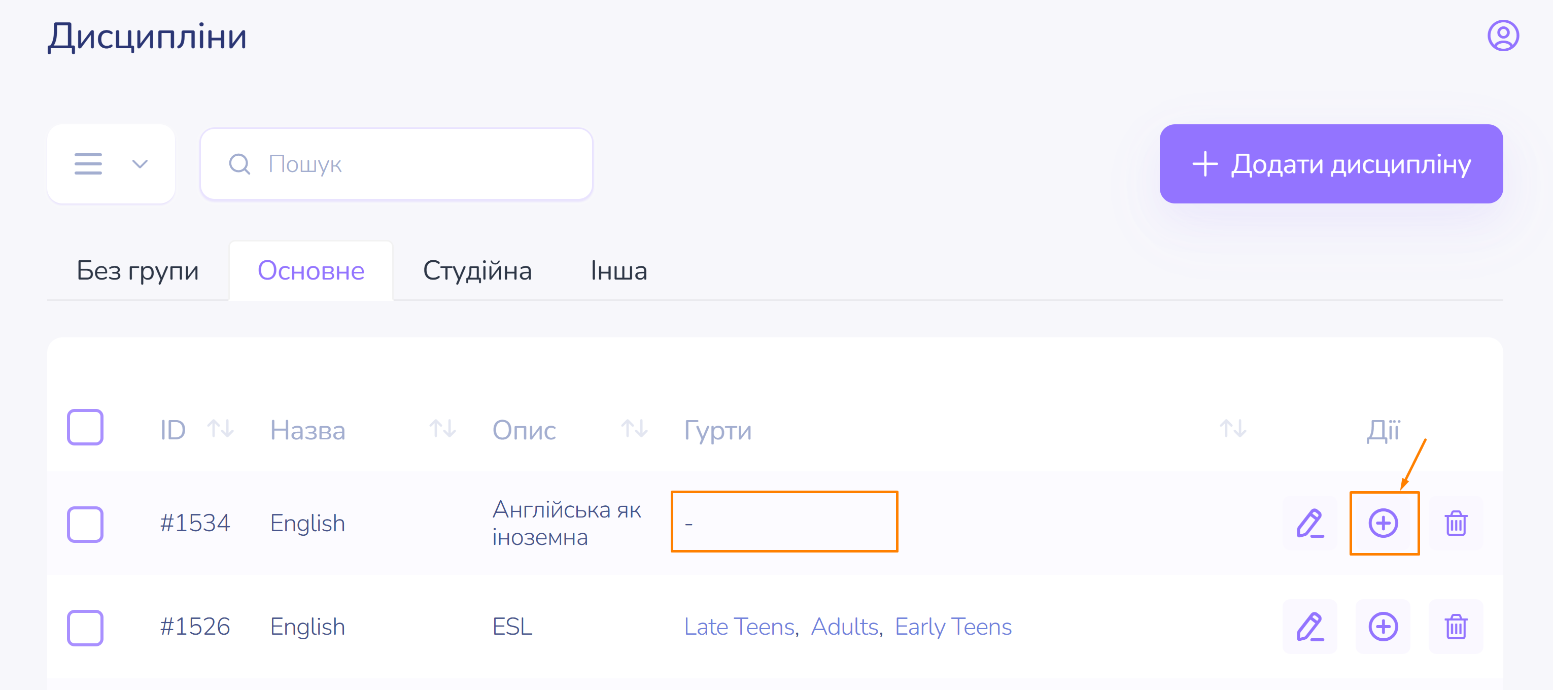 - У рядку з відповідною дисципліною, праворуч у розділі Дії, натисніть на символ Додати.